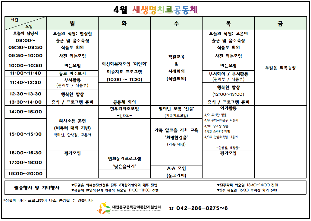 2026년 4월 주간재활프로그램 시간표